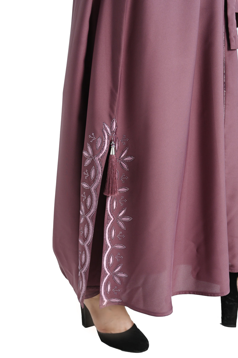 Grace your wardrobe with this dusty Pink abaya, designed for women who value modesty and elegance. The abaya features delicate embroidery on the sleeves and side panels, paired with a matching waist belt for a flattering fit.