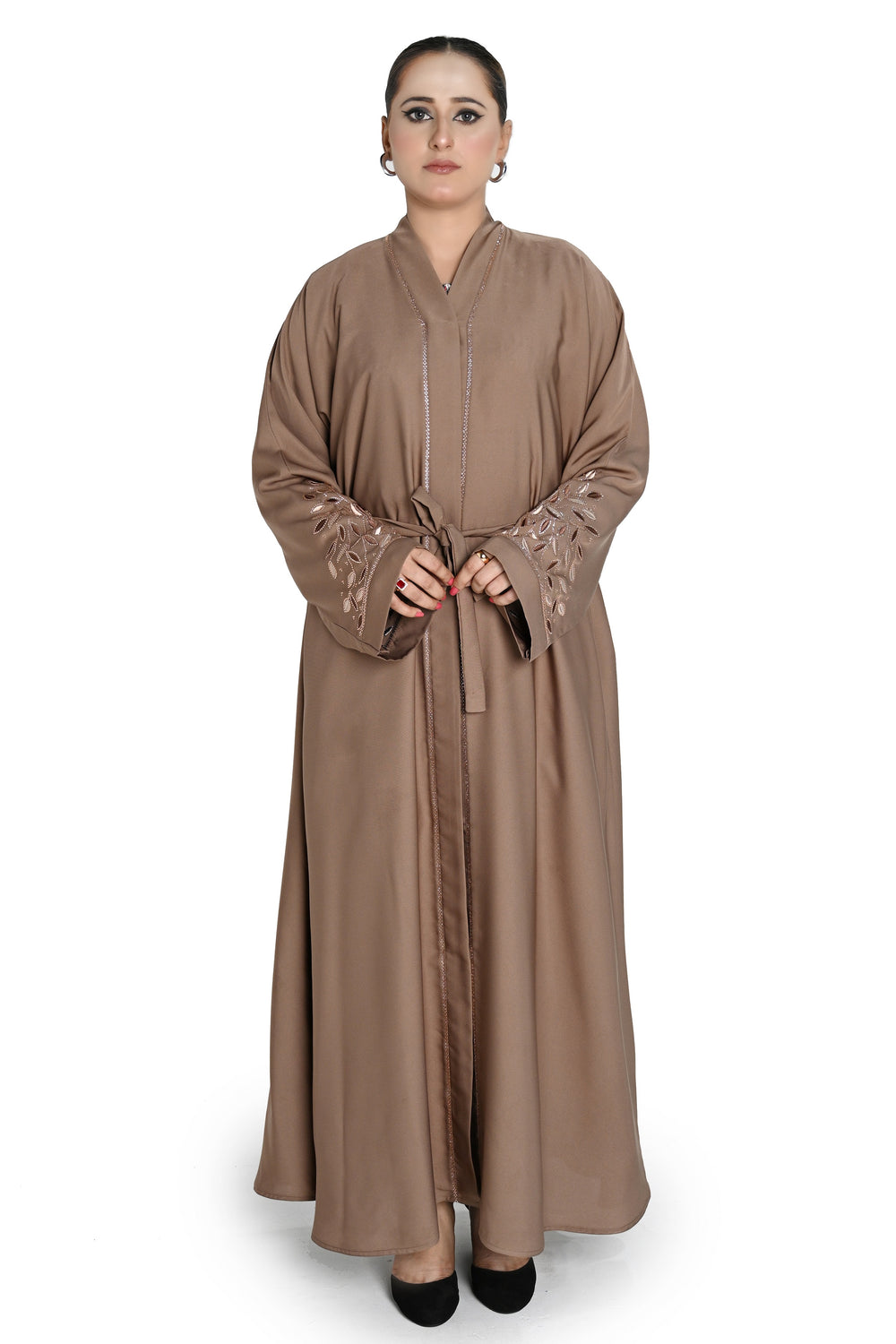 Elevate your modest wardrobe with this chic brown abaya, crafted from soft, premium fabric for all-day comfort. Featuring delicate embroidery on the sleeves and a matching waist belt, this abaya combines tradition with modern style.
