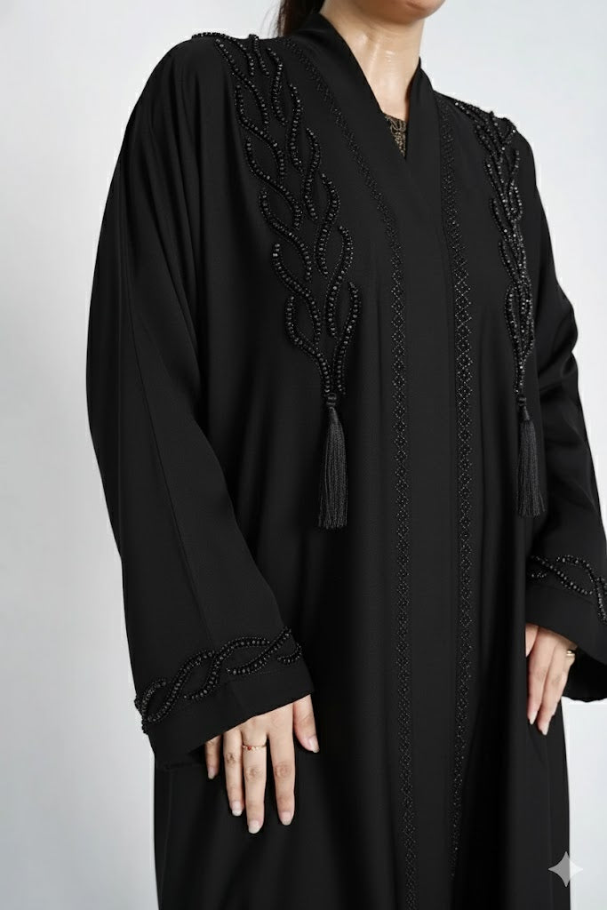 This elegant abaya is a perfect blend of sophistication and tradition. Adorned with delicate embroidery and intricate beadwork, it’s an ideal choice for special occasions as well as everyday wear. The front tassel detailing adds a unique and graceful touch to the overall design.